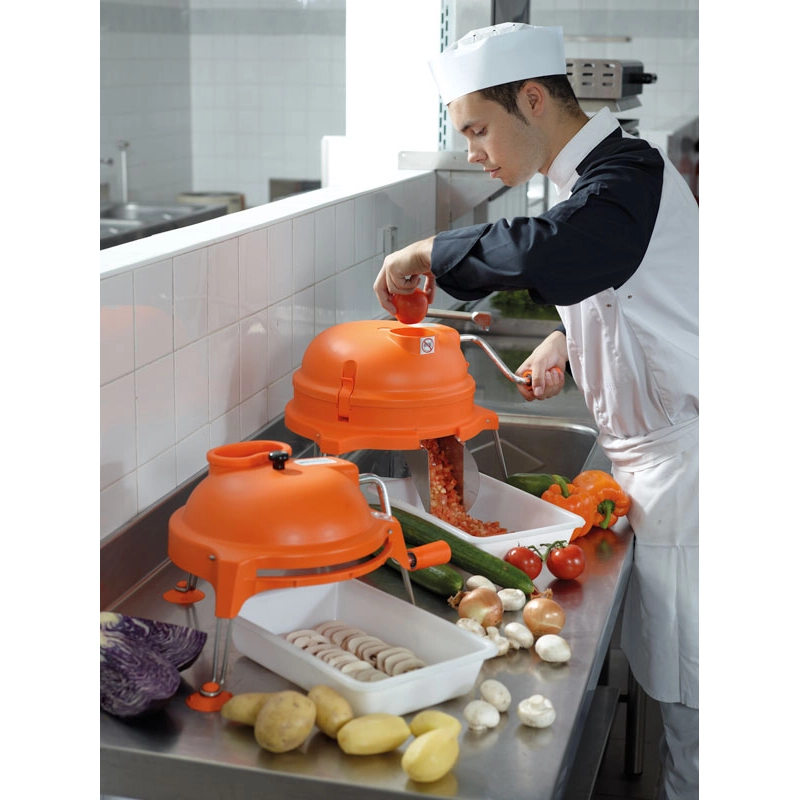 Mit nur wenigen Handgriffen verwandeln Sie frisches Gemüse in gleichmäßige Stücke, die sich perfekt für Salate, Suppen, Pfannengerichte und vieles mehr eignen. Über die Einfüllöffnung geben sie die Lebensmittel mit Hilfe des Stößels hinein und sie kommen über den Auswurfschacht hinaus.